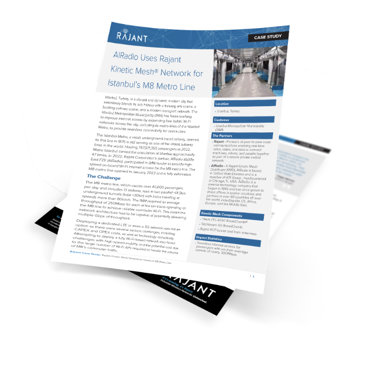 AIRadio VP Sales and Business Development Koral Turkkan shared, “Deploying a dedicated LTE or even a 5G network was not an option due to challenges, such as CAPEX and OPEX costs. Further, neither LTE or 5G provide seamless handoffs to maintain user-application connections, whether for entertainment like Netflix or live-streamed Google Meet. As a distributor of Rajant, we know Kinetic Mesh is a truly disruptive technology that has delivered several very large project wins for AIRadio, so we brought this high bandwidth wireless solution to IMM’s attention. Now, the M8 metro line’s 40,000+ daily passengers have the convenience and peace-of-mind access to the internet as they rapidly travel underground. A first ever real-time video conference between Turkey, Kazakhstan, and South Africa was captured using Google Meet.” Watch here.