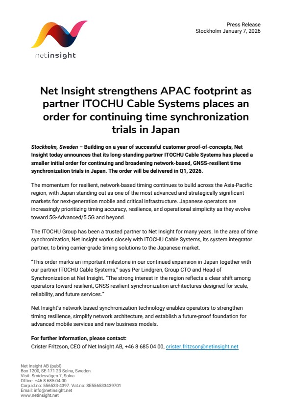 “This order marks an important milestone in our continued expansion in Japan together with our partner ITOCHU Cable Systems,” says Per Lindgren, Group CTO and Head of Synchronization at Net Insight. “The strong interest in the region reflects a clear shift among operators toward resilient, GNSS-resilient synchronization architectures designed for scale, reliability, and future services.”